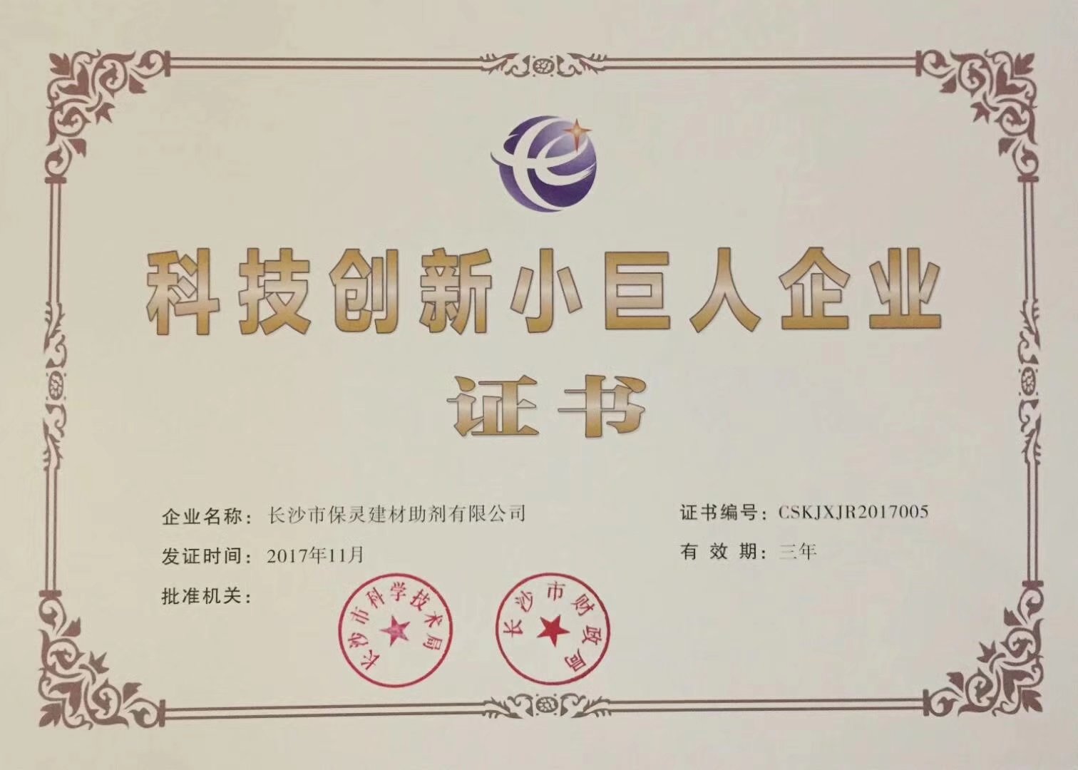 熱烈祝賀長沙市保靈建材助劑有限公司榮獲“科技創(chuàng)新小巨人”榮譽稱號。我們將以“科技創(chuàng)新,服務(wù)第一”的經(jīng)營理念,繼續(xù)努力、回饋客戶!